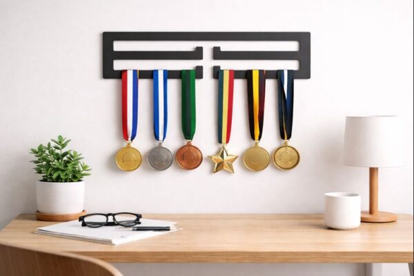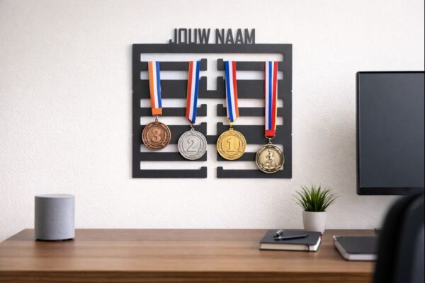 Dankzij de breedte van 25 cm en een hoogte van 8 cm blijft het geheel compact, terwijl de medailles overzichtelijk en netjes hangen zonder elkaar te overlappen.